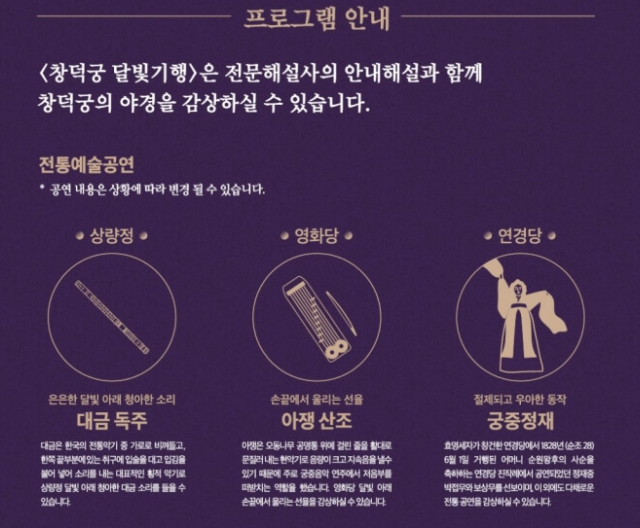 단순한 창덕궁 산책이 아닌 전문해설사의 안내해설과 함께할 수 있습니다. 아름다운 야경과 전통예술공연도 즐길 수 있는 기회를 제공합니다.