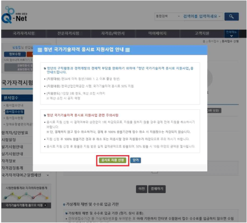 2) 응시료 지원 안내 유의사항 확인 후 지원 신청 클릭